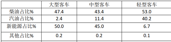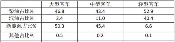 由上表可知,无论是今年6月还是1-6月,新能源在大型客车中占比最高(主要还是新能源大型公交多),次高是在中型客车中;在轻型客车占比最小;柴油类在轻型客车中占比最高,其次是在中型客车中;汽油类主要是在轻型客车中占比较高,其次是在中型客车中(主要是一些前置的中型商务接待车型,如7米丰田考斯特、宇通T7等)。
