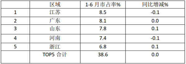上表显示,2022年1-6月中型客车流向河南市场份额最大,同比增加0.2%;其次是广东区域市场,同比也增加0.1个百分点 ;再次是山东区域,同比增加0.1%。TOP5累计占比37.4个百分点,同比增加0.4个百分点;