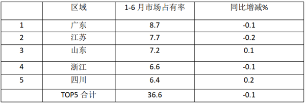 可见,2022年1-6月轻型客车流向广东市场份额最大,同比减少0.1%;其次是江苏区域市场,同比减少0.2% ;再次是山东区域,同比增加0.1%。TOP5累计占比36.6个百分点,同比减少0.1%。