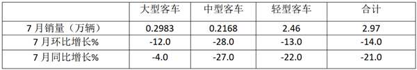 今年7月客车总销量为2.97万辆,同比下降21.0%;