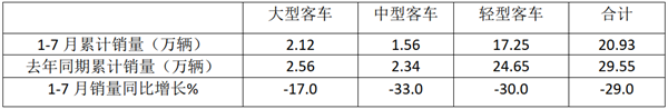 今年1-7月客车总销量为20.93万辆,累计同比下降29%;