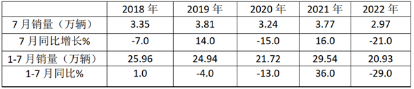上表可见,2022年7月客车销售2.97万辆,在近5年同期中最低;2022年1-7月客车累计销售20.93万辆,也是近5年1-7月中最低的。