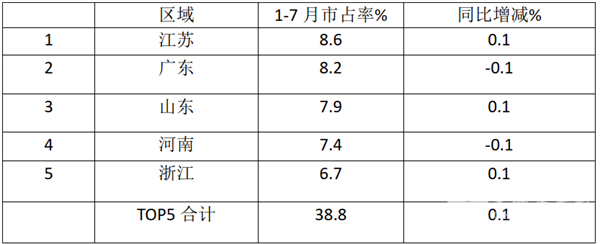 上表显示,2022年1-7月中型客车流向河南市场份额最大,同比增加0.1%;其次是广东区域市场,同比持平;再次是山东区域,同比增加0.1%。TOP5累计占比37.5个百分点,同比增加0.2个百分点;