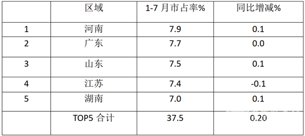 3、根据上牌信息统计,1-7月轻客车销量占比前5名区域: