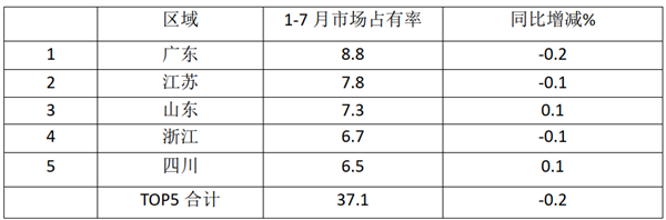 可见,2022年1-7月轻型客车流向广东市场份额最大,同比减少0.2%;其次是江苏区域市场,同比减少0.1% ;再次是山东区域,同比增加0.1%。TOP5累计占比37.1个百分点,同比减少0.2%。