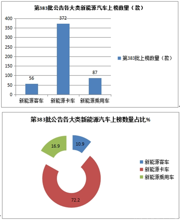 按汽车大类划分,第383批公告中上榜的新能源车型中,包括新能源客车56款,占比10.9%;新能源乘用车上榜87款,占比16.9%;新能源专用车上3721款,占比72.2%。