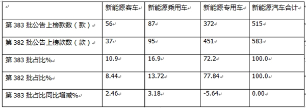表1,根据工信部数据,第383批新能源汽车公告中各大类车型上榜数量及占比、占比环比增减: