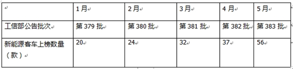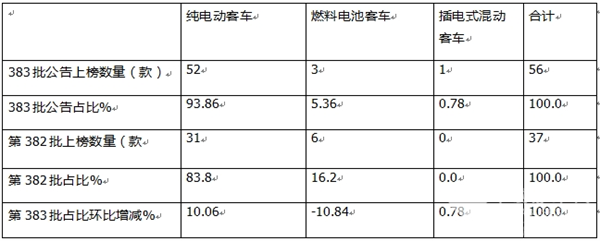 上表可见,本批次公告(第383批)上榜56款新能源客车,创今年以来各批次公告上榜数量新高,这是本批次公告的一个显著特点,反映了目前我国新能源客车市场正在积极向好。