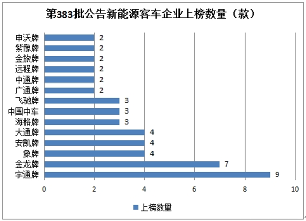 在第383批公告中共有近20个客车品牌参与了新能源客车新品申报,各个品牌上榜数量统计如下(只统计上榜数量在2款以上车型的企业):