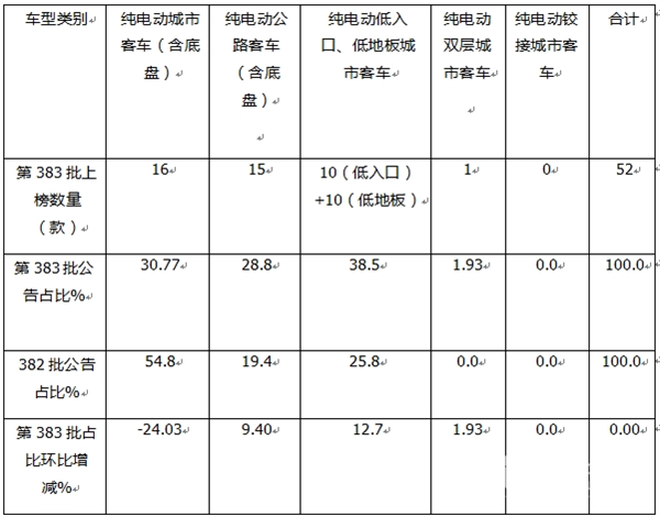 表4,根据第383批公告数据,按目标用途划分上榜的52款纯电动客车(不含3款燃料电池和1款插电式混动上榜车型)车型类别结构占比及占比环比增减统计: