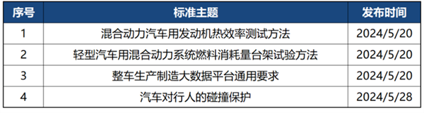 2024年5月有4部新公示标准法规,包括混合动力汽车发动机热效率测试、轻型汽车混合动力系统燃料消耗量试验方法、整车制造大数据平台要求,以及汽车行人碰撞保护。详情如下: