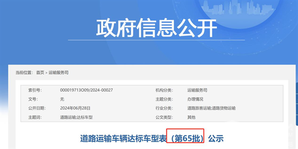 截图1,道路运输车辆达标车型表(第65批公示)