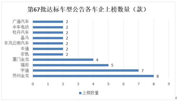 上表说明,在第67批交通部上榜达标道路运输客车车型中: