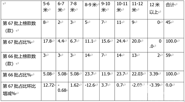 表2,根据交通部数据,第67批客车达标车型公告中上榜的各长度段车型数量、占比比及环比增减统计: