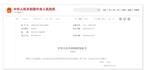 2024年10月23日,国务院发布了我国城市公共交通领域的第一部行政法规----《城市公共交通条例》(下简称《条例》),并从2024年12月1日正式实施。