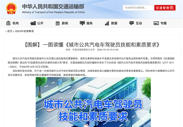 近日,交通运输部组织编制并发布了行业标准《城市公共汽电车驾驶员技能和素质要求》(JT/T 1511—2024),旨在进一步规范城市公共汽电车驾驶员职业管理,加强驾驶员身心健康关爱和技能培训,同时有力保障城市公共汽电车运营安全,促进驾驶员职业健康和可持续发展,提高乘客的通勤体验。该标准将于2024年12月1日正式实施。