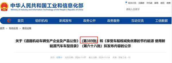 2024年11月7日,工信部发布关于《道路机动车辆生产企业及产品公告》(第389批公告,下也称“本批次公告”),这是2024年以来工信部发布的第11个批次的汽车新车产品公告。