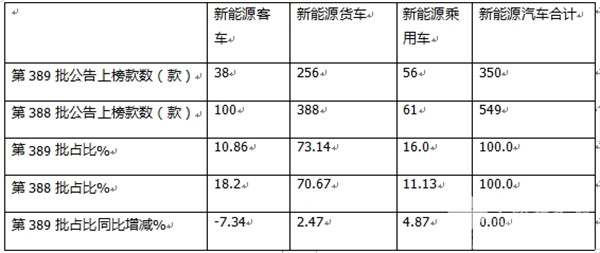 表1,根据工信部数据,第389批新能源汽车公告中各大类车型上榜数量及占比、占比环比增减: