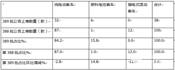 按汽车大类划分,第389批公告中上榜的新能源车型中,包括新能源客车38款,占比10.86%,占比环比减少7.34个百分点。