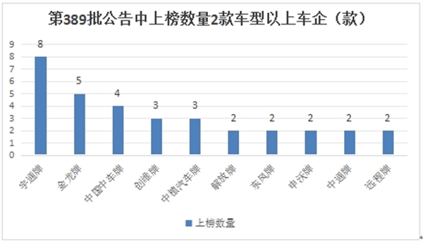 在第389批公告中共有15个客车企业参与了新能源客车新品申报,各个品牌上榜数量统计如下(只统计上榜数量2款机以上品牌企业):