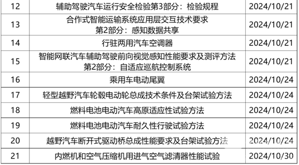 2024年10月,汽车行业迎来共计有21部新标准法规征求意见,涉及专用车、辅助驾驶、制造工艺、燃料电池汽车等多项内容,具体统计如下: