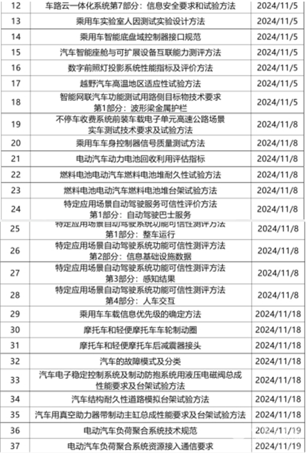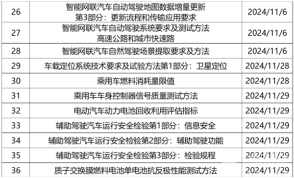 2024年11月期间共有新发布标准36部,涉及车辆换电、轮胎、零部件、智能化等领域。详情如下: