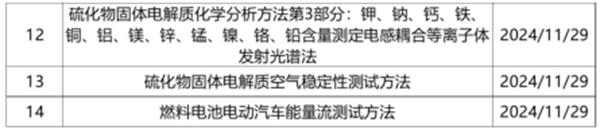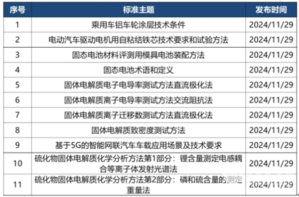 2024年11月,汽车行业迎来共计有14部新标准立项,大部分与电池相关,此外还包括智能网联汽车、零部件等内容。具体如下: