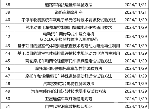 2024年11月期间共有51部征求意见稿发布,数量较多。涉及自动驾驶、燃料电池、摩托车、车联网等方面,详情如下: