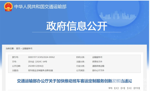 2024年12月6日,交通运输部办公厅发布了《关于加快推动班车客运定制服务创新发展的通知》(下简称《通知》)。