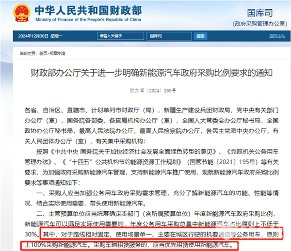 2024年12月30日,财政部办公厅发布关于进一步明确新能源汽车政府采购比例要求的通知(下简称《通知》),对公务用车采购总量中新能源汽车的占比进行了明确规定。