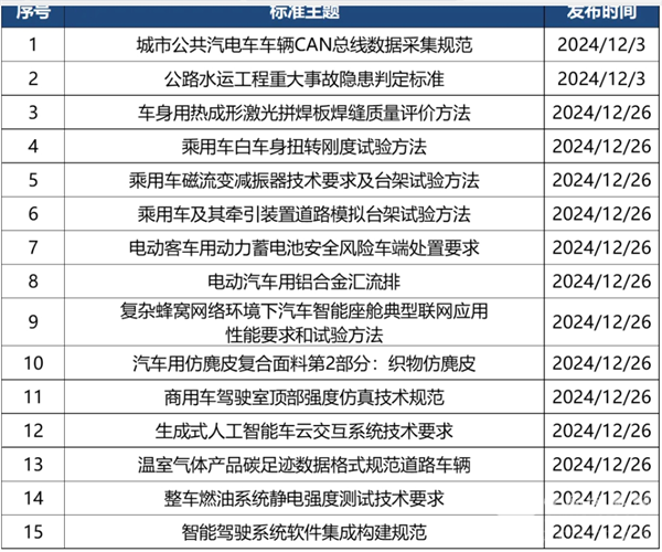 2024年12月,汽车行业迎来共计有15部新标准立项,大部分涵盖智能网联汽车、工艺、动力电池等多个领域容。具体如下: