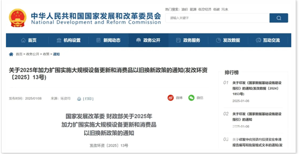 2025年1月8日,国家发展改革委、财政部发布《关于2025年加力扩围实施大规模设备更新和消费品以旧换新政策的通知》(下简称《通知》)。