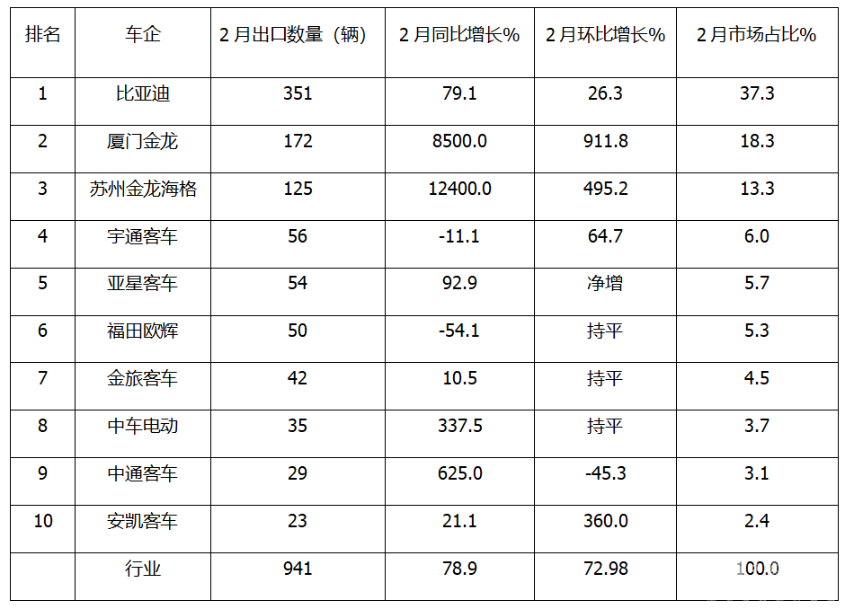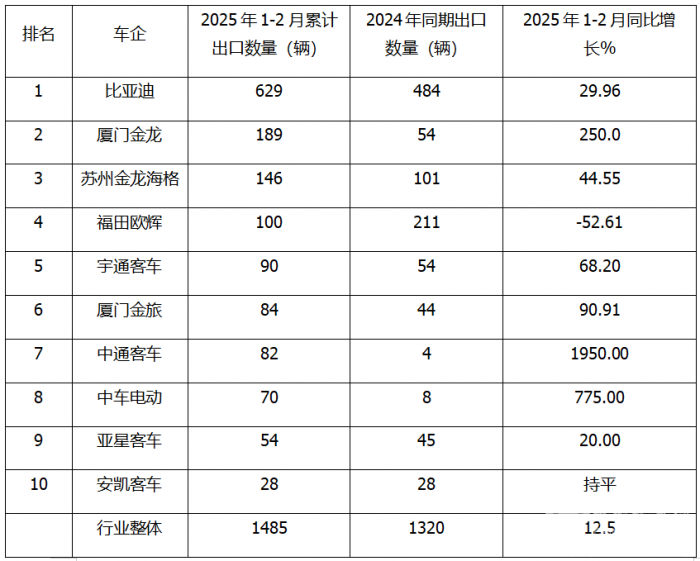 上表显示,在2025年前2月新能源客车累计出口前10车企中: