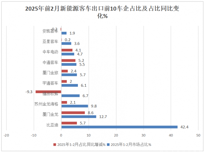上图表显示,在2025年2月我国新能源客车出口前10企业销量、同比及市场占比中: