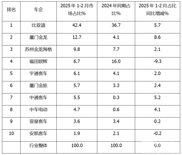 表4,根据中国客车统计信息网数据,2025年1-2月前10车企累计出口占比及占比同比增减: