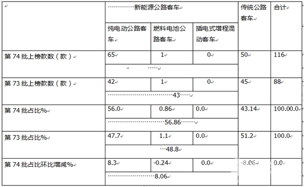 表1,第74批交通部达标车型公告上榜的各动力车型数量、占比与上一批环比(数据来源:交通部)