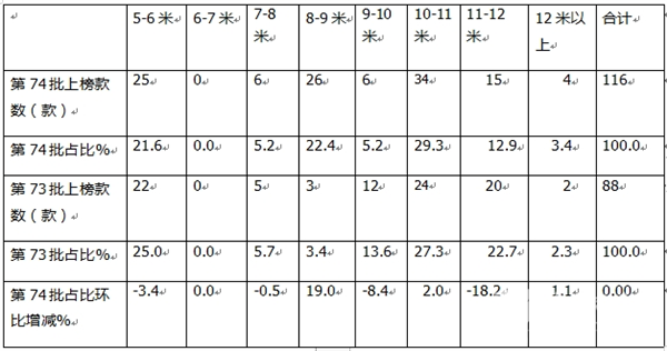 表2,根据交通部数据,第74批客车达标车型公告中上榜的各长度段车型数量、占比比及环比增减统计: