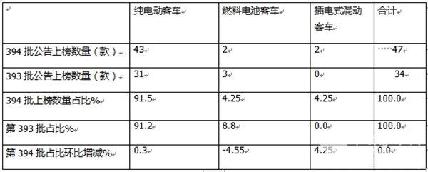 表3,根据第394批公告数据,按目标用途划分上榜的47款新能源客车车型类别结构占比及占比环比增减统计: