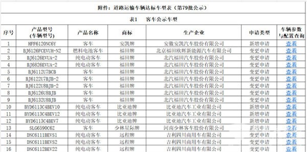 上图可见,在交通部第79批上榜的达标的道路运输客车车型公告中: