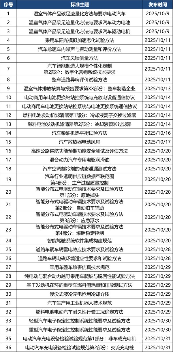 2025年10月共计发布征求意见稿36部,涉及涉及碳排放、燃料电池、零部件等。详情如下: