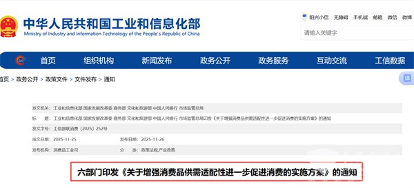 2025年11月25日,工业和信息化部、国家发展改革委、商务部、文化和旅游部、中国人民银行、市场监管总局等6部门联合印发的《关于增强消费品供需适配性进一步促进消费的实施方案》的通知(下简称《通知》)。
