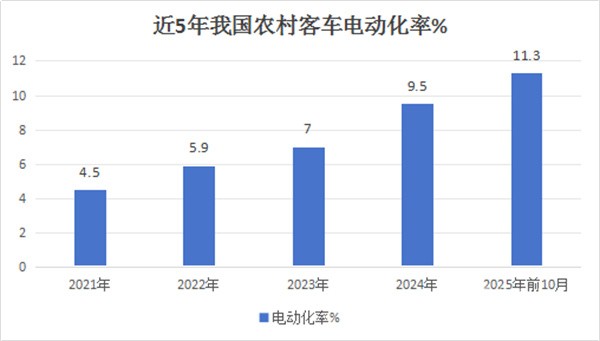 特别值得一提的是,2025年前10月农村客车电动化率已经达到11.3%,创下近5年新高,当然也创下史上新高(2021年之前我国农村客车电动化率从未超过3%)。