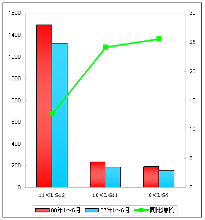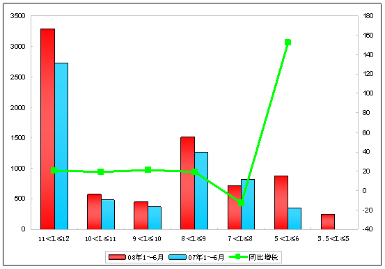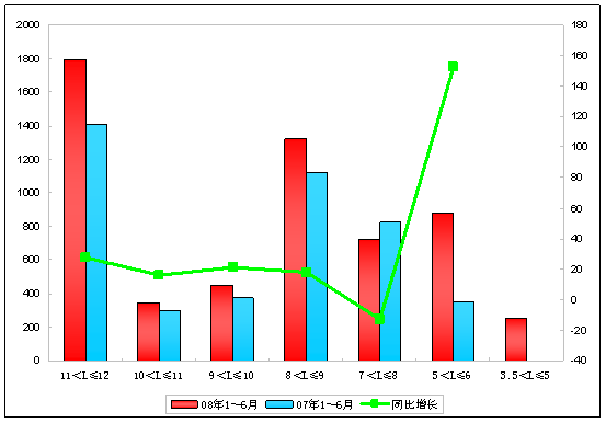 可以看出:08年1~6月与07年同期比,卧铺客车整体处于下滑势头。下降的幅度达到14.6%。卧铺车的主体产品10~11米是下降数量最多的区间;而同时只有12米以上区间段呈现上升石头,一改前几月的下滑趋势。