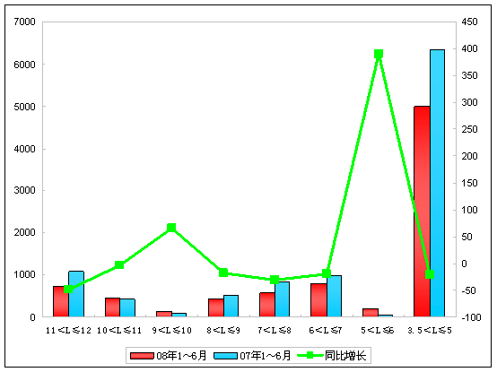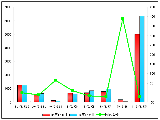 由上表可以看出:08年1~6月销售比去年同期增长24.26%,除3.5~5米以外,,全线增长。增长最快的是大于12米的特大型客车,增幅达到804%,其次是11~12米,增长达到40.82%,下降最多的是3.5~5米,达到-19.9%。