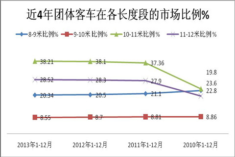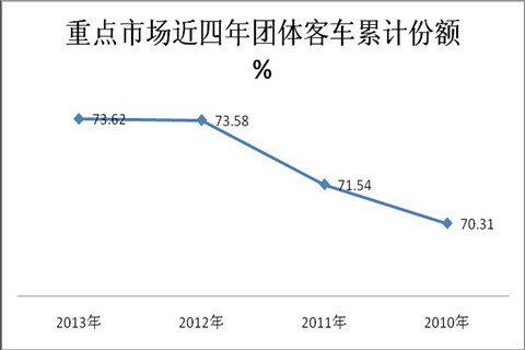 1、近4年1-12月以来,接送职工上下班始终是团体车最大的目标市场,占据团体客车总销量的比例至少在50%以上。但近年来,接送职工上下班的团体车比例在逐年下降,从2010年的60%逐年下降到2013年的52.1%,下降趋势较明显。