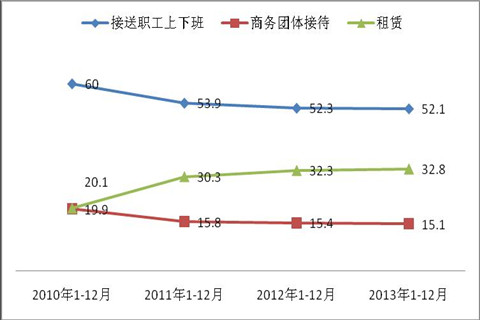 3、团体租赁市场作为团体车市场中重要的细分市场之一,占据团体车市场的比例近年上升趋势非常明显,是团体车所有细分市场中表现最为突出的。市场份额从2010年1-12月的20.1%逐年上升到2013年的32.8%,发展势头非常迅猛. 产生上述特点的原因大致如下: