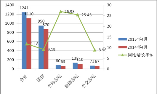 三、2015年4月份考斯特客车整体及细分市场销量分析--团体单位是购买考斯特车型的绝对主体,销量同比增长9.26%;旅游客车市场其次,销量同比上升近68.5%;公交客运是第三大细分市场,销量同比增长38%