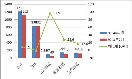 2015年7月份国内考斯特市场累计销售1211辆,与2014年同期相比有所上升。作为政府、企事业单位、公检法司、星级酒店接待等团体市场累计销售830辆,占据考斯特市场68.5%的市场份额,处于垄断地位,但由于政府部门费用控制比较严格,公务用车得到限制,同比还是出现了下降。公路、旅游市场占据考斯特市场的19.9%左右,而公交客运虽然升幅不大,也是按用途划分细分市场中正增长的细分市场之一,但基数较低,仅占市场份额的11.56%左右(详见上表,数据来源:车管所上牌数)。新一届国家领导人上台后,大力推进并贯彻落实《八项规定》,在公费旅游、接待用车等方面严格管控,在一定程度上影响了考斯特市场用车需求,而考斯特车型在旅游租赁市场出现近28.6%的上升。