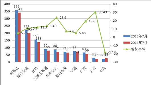 四、2015年7月,主要竞争对手中,厦门金旅是国产考斯特销量最大的品牌,市场份额同比上升超过10%,江铃考斯特是国产品牌中销量次大的品牌,丰田考斯特也上升5.28%,仍然占据了中国考斯特市场中近三成的市场份额