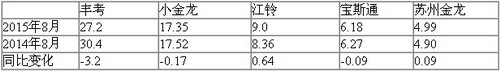 6、2015年8月考斯特客车总体销量同比增长了7.96%,市场集中度为79.15%,而2014年同期为82.39%,同比下降了2.5个百分点。